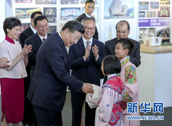 6月29日下午,國家主席習近平在香港西九文化區出席《興建香港故宮文化博物館合作協議》簽署儀式。這是習近平同現場演唱粵劇選段的兩名兒童親切交談。新華社記者 丁林 攝