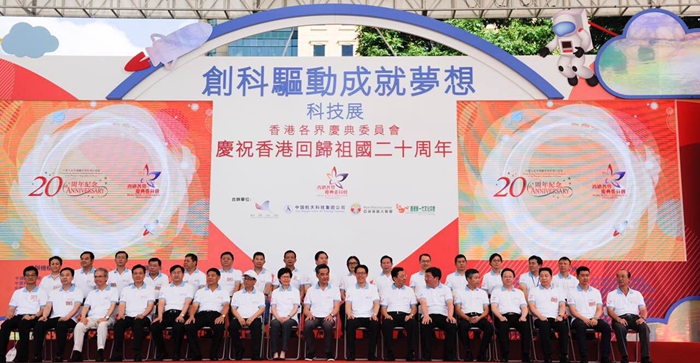 本網訊 6月28日下午,香港各界慶典委員會在維多亞利公園舉辦「創科驅動 成就夢想」科技展開幕禮。我辦主任張曉明,副主任林武、譚鐵牛與全國政協副主席、行政長官梁振英,候任行政長官林鄭月娥,外交部駐港公署特派員謝鋒,駐港部隊司令員譚本宏,中國科學技術協會書記處書記束為、中國航天科技集團公司副總經理張建恒,航天科技專家於登雲、楊宏、董瑤海、劉紅,航天員楊利偉、景海鵬、陳冬等出席並主禮。