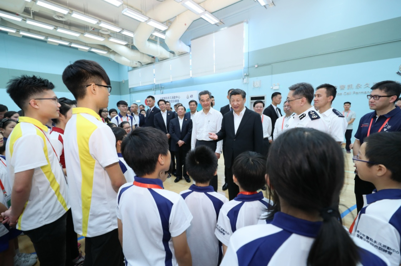 6月30日上午,國家主席習近平來到香港少年警訊永久活動中心暨青少年綜合訓練營考察,看望正在訓練的香港青少年。這是習近平同少年警訊成員親切交談。(新華社記者 蘭紅光 攝)