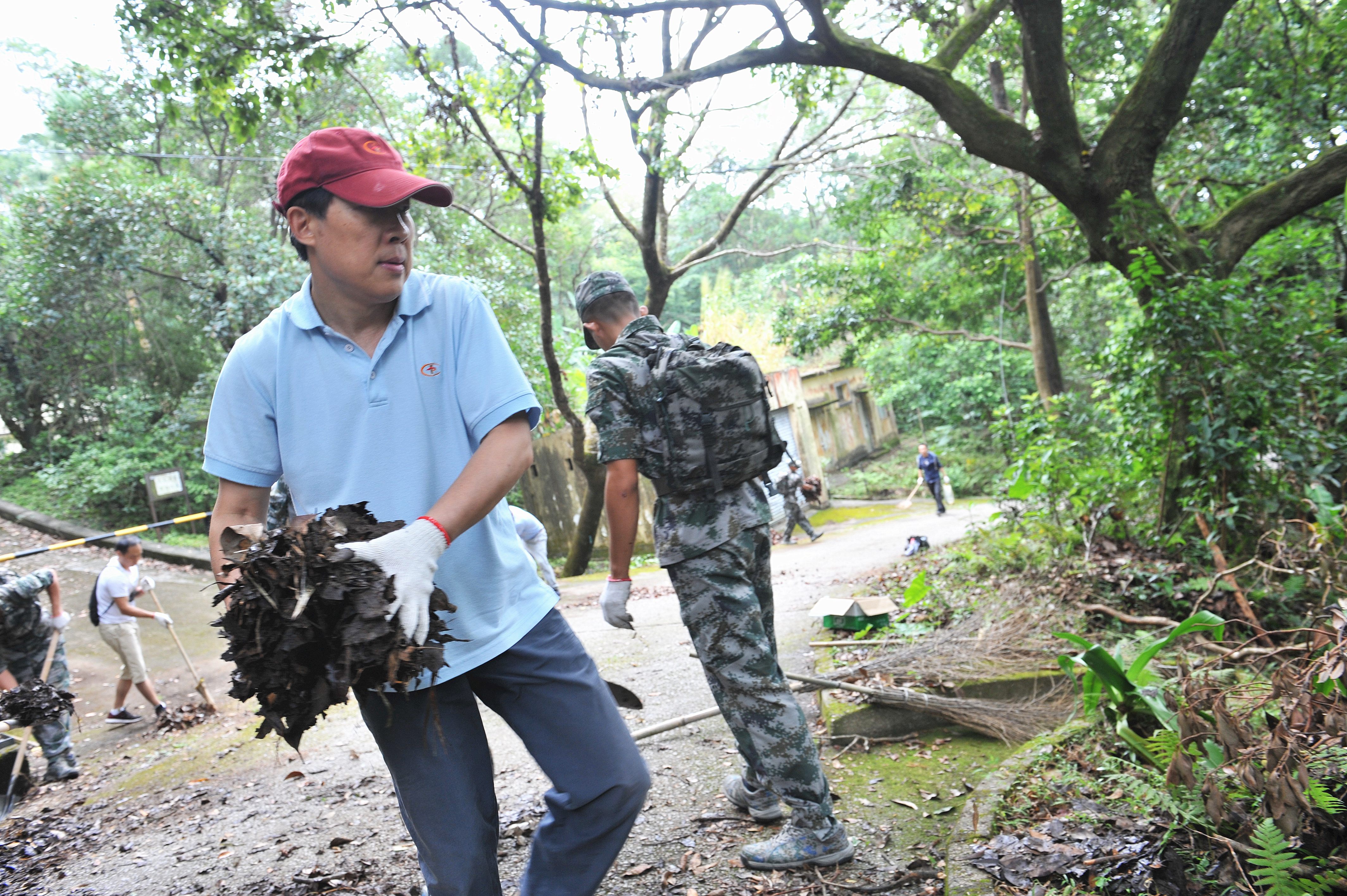 9時許,義工隊伍抵達麥理浩徑。600餘人按照分工計劃,由我辦副主任楊建平、外交部駐港特派員公署副特派員楊義瑞、駐港部隊副司令員田永江、香港中國企業協會副會長兼總裁張夏令各率一隊,每支隊伍分若干小組,分別到指定路段展開清理工作。大家全力投入,用鐵鍬、掃把、電鋸等工具清掃道路和台階上的殘枝、樹葉、石頭等雜物,疏通排水溝淤泥堵塞,鋸開路邊倒塌的樹榦並堆放到一處。參與活動的義工們十分投入,人人都汗流浹背,但臉上都洋溢着開心的笑容,處處是熱火朝天的義務勞動景象。一處地方清理乾淨了,大家就立即趕往下一個清理現場。餓了累了,就在路邊稍作休息,簡單吃點自帶的乾糧。行山市民路過看到,紛紛向義工隊伍豎大拇指稱讚並表示感謝,有些市民還主動提出和義工們合影留念。