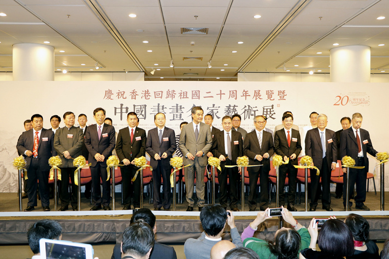 本網訊 5月24日下午,由香港各界文化促進會主辦的「慶祝香港回歸祖國二十周年展覽暨中國書畫名家藝術展」開幕典禮在香港舉行。香港特區行政長官梁振英、全國人大常委柳斌傑、我辦副主任楊健等共同為展覽開幕式主禮。香港各界文化促進會榮譽會長譚錦球等300多名香港以及內地文化藝術界人士出席活動。