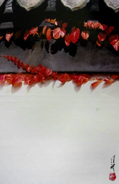 我也告訴學思,曾經在《攝影世界》雜誌看過陳復禮的一幅作品《霜葉紅於二月花》。這幅作品構圖簡潔,雖然只截取一段小屋檐,但卻透過檐下的寥寥紅葉,展現了與春光鬥艷的絢麗秋色,彰顯出生機勃勃的生命力,觀之和諧舒暢,品之耐人尋味。