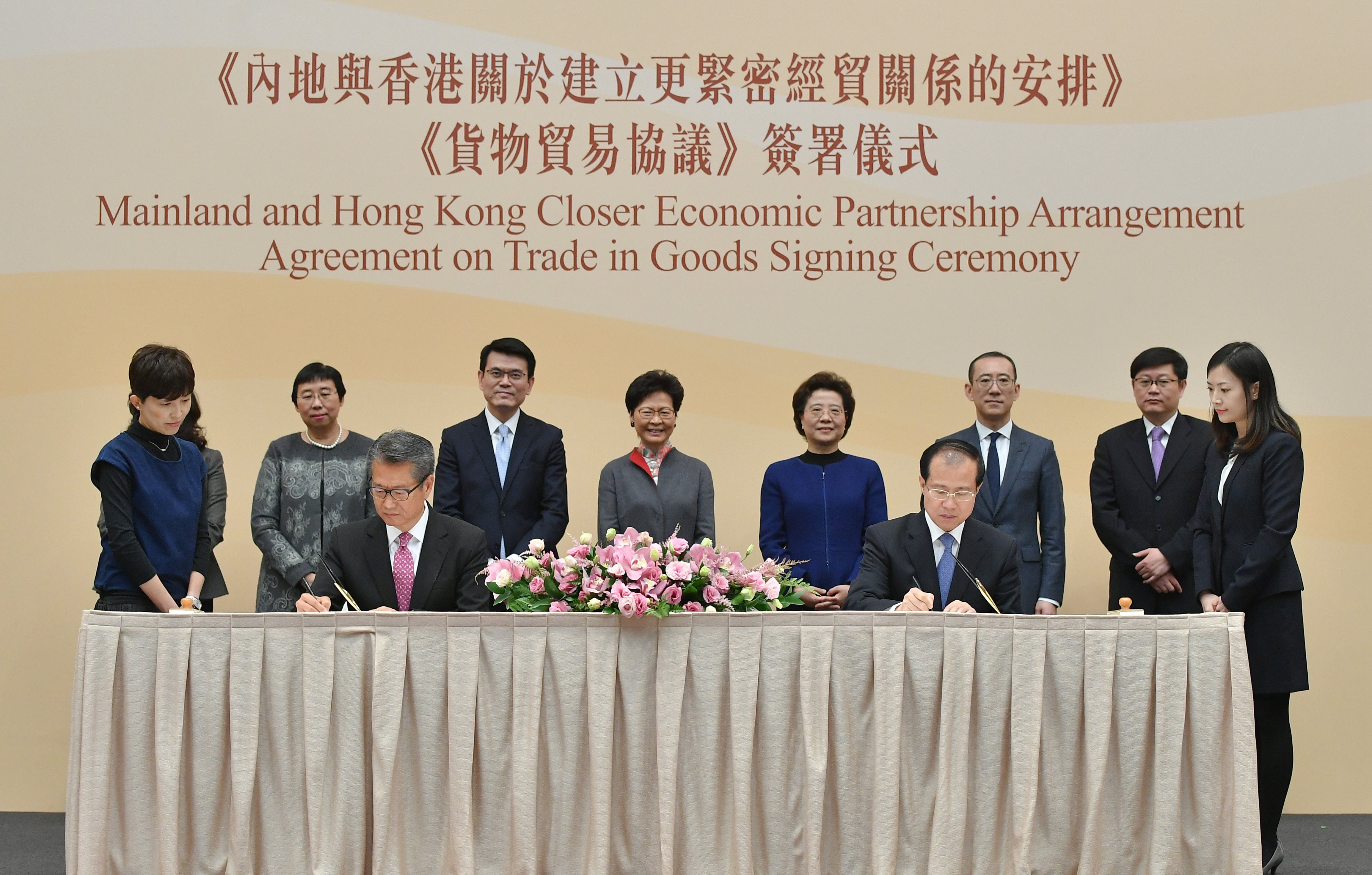新的《CEPA貨物貿易協議》由傅自應與特區政府財政司司長陳茂波簽署,協議自簽署之日起生效,並將於2019年1月1日起正式實施。