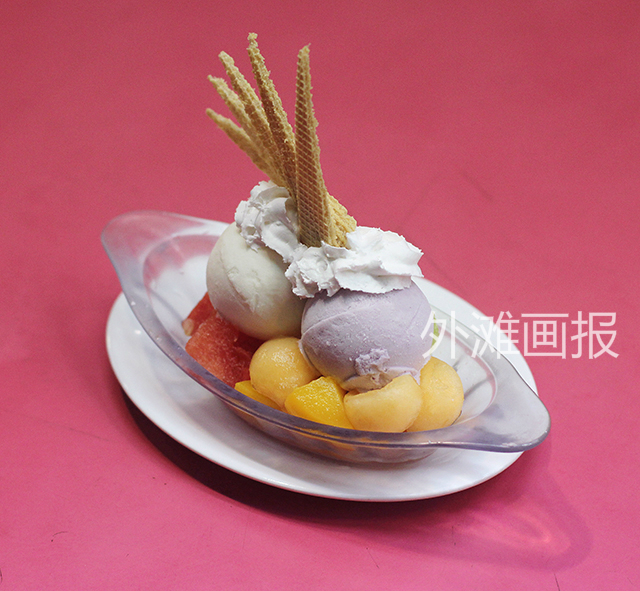 鮮雜果新地有多種冰淇凌可供選擇,以防失嘴挑了不和口味的搭配,就依着菜單推薦選了香草和芋頭味。拿起威化餅沾奶油和冰淇淋,伴着松脆且絲絲入滑。
