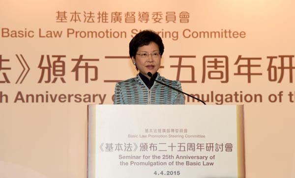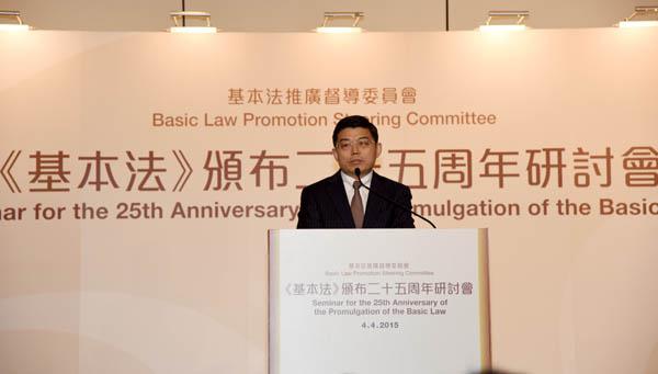 4月4日,香港特區政府基本法推廣督導委員會在香港會議展覽中心舉辦紀念香港基本法頒佈25周年研討會。全國政協副主席、原行政長官董建華,行政長官梁振英,中央政府駐港聯絡辦主任張曉明、副主任黃蘭發,外交公署副特派員佟曉玲和駐港部隊參謀長周尚平等應邀出席研討會。特區政府全體政治委任官員,行政會議非官守成員,現任及歷任基本法推廣督導委員會委員,全國人大常委會香港基本法委員會港方委員,前香港基本法起草委員會港方委員,來自工商界、教育界、專業界及青年界的團體代表等400餘人參加研討會。