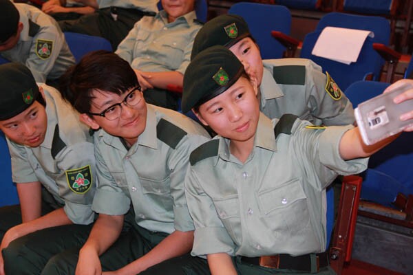 香港青少年軍總會成員用手機自拍留念。(圖片來源:中央政府駐港聯絡辦)