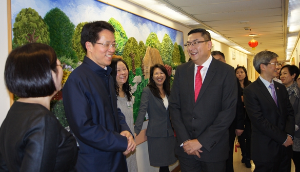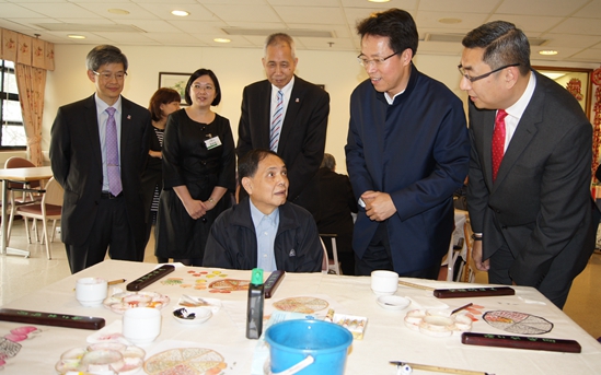 在東華三院主席施榮恒、執行總監吳志榮的陪同下,張曉明觀摩了長者國畫小組及工藝小組的康樂活動,在為精神病康復者提供職業培訓的社會企業「心思廚房」與老人家共享糕點美食。