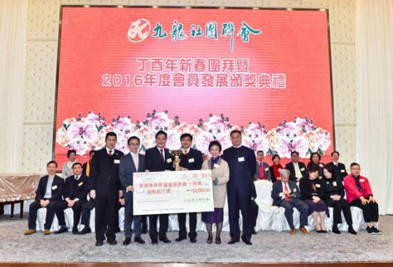本網訊 2月11日,我辦副主任林武應邀出席九龍社團聯會丁酉年新春團拜暨2016年度會員發展頒獎禮,為獲得最積極發展會員的團體頒獎並致辭。