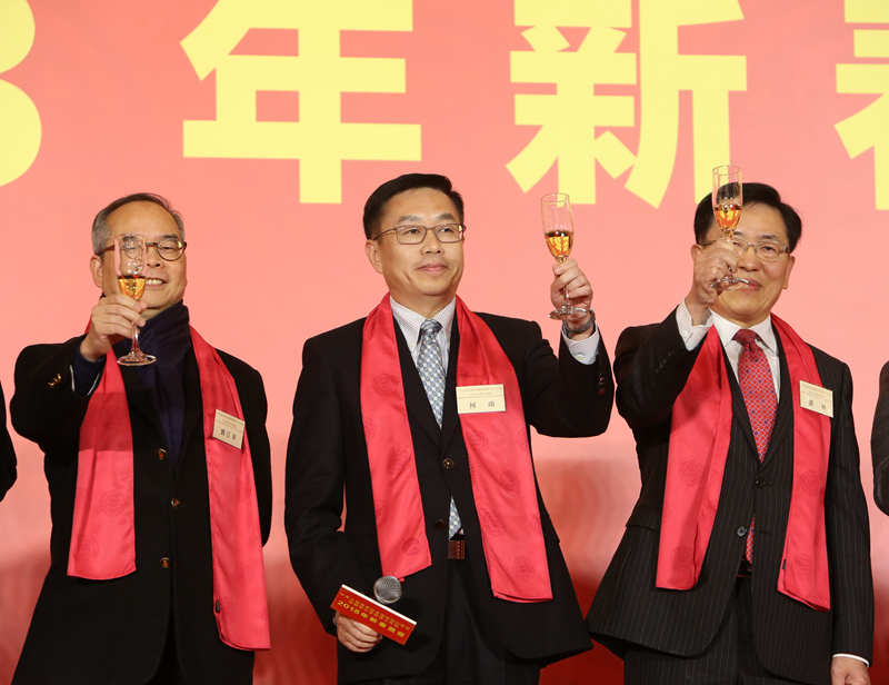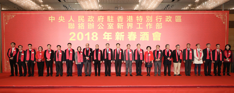 本網訊 我辦新界工作部7日在荃灣如心酒店舉行2018年新春酒會。我辦副主任何靖帶領祝酒;香港特區政府民政事務局局長劉江華,新界各界大聯盟主席團主席張學明,行政會議成員、立法會議員、新界鄉議局主席劉業強,新界工作部負責人及新界主要愛國愛港社團首長等共同主禮祝酒儀式。