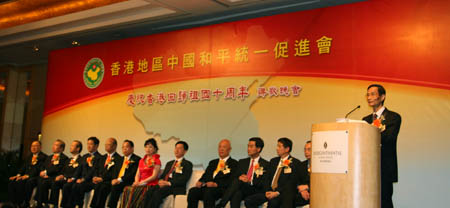 各位嘉賓、各位朋友,我們的偉大祖國,正在以日新月異的速度向着新世紀的宏偉目標邁進,然而要真正實現中華民族的偉大復興,必須早日完成祖國統一大業。從當前的形勢來看,兩岸關係和平發展的潮流勢不可擋。在前不久舉行的「兩岸經貿文化論壇」上,國共兩黨再次合作,中央再次展現了積極發展兩岸關係的決心和誠意。但是我們也必須清醒地看到,「台獨」的危險性沒有消除。維護國家主權和領土完整,反對「台獨」分裂行徑,兩岸同胞、港澳同胞和海外僑胞,責無旁貸。讓我們繼續高舉「和平統一」的旗幟,攜手並肩,同舟共濟,為建設香港和諧社會、維護香港的長期繁榮和穩定,為推動港台關係和兩岸關係向前發展,為促進祖國統一大業早日實現,做出新的貢獻。