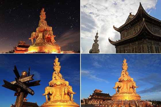 金頂上高48米(代表阿彌陀佛的48個願望)的十方普賢聖像,是世界上最高的金佛,也是峨眉金頂的中心。普賢的十個頭像分為三層,神態各異,代表了世人的十種心態。大象背上第一層為普賢菩薩的四頭像和兩面身;第二層為普賢菩薩四頭像;最高層為前後普賢菩薩頭像。聖像內為484平方米的佛中殿,供奉阿彌陀佛銅像,四週繞漢白玉雕佛像。 金光耀眼的普賢像會毫無懸念的震懾每個游客,産生一種由心而生的敬畏。